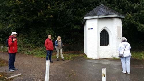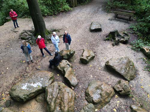 Am Praxistag im Oktober ging es diesmal zu den Frauensteinen und der Basilika St. Margareta in Düsseldorf-Gerresheim. Die Exkursion wurde vorbereitet von der Geomantin und Leiterin einer Naturschule sowie Kräuterpädagogin Andrea Lupp, aus Düsseldorf. Um die Frauensteine im Aaper Wald (Bild oben) ranken sich viele Geschichten als alter Kultplatz, nicht nur für Frauen. Die Basilika St. Margareta war bis 1803 Stiftskirche des Gerresheimer Frauenstifts, das bereits im 9. Jahrhundert entstand und zu den ältesten Kanonissenstiften der Erzdiözese Köln gehörte. In der Nähe der Basilika untersuchten wir noch eine kleine Kapelle am Gericus-Pützgen (Bild unten), die direkt über einer sagenhaften Quelle stehen soll.